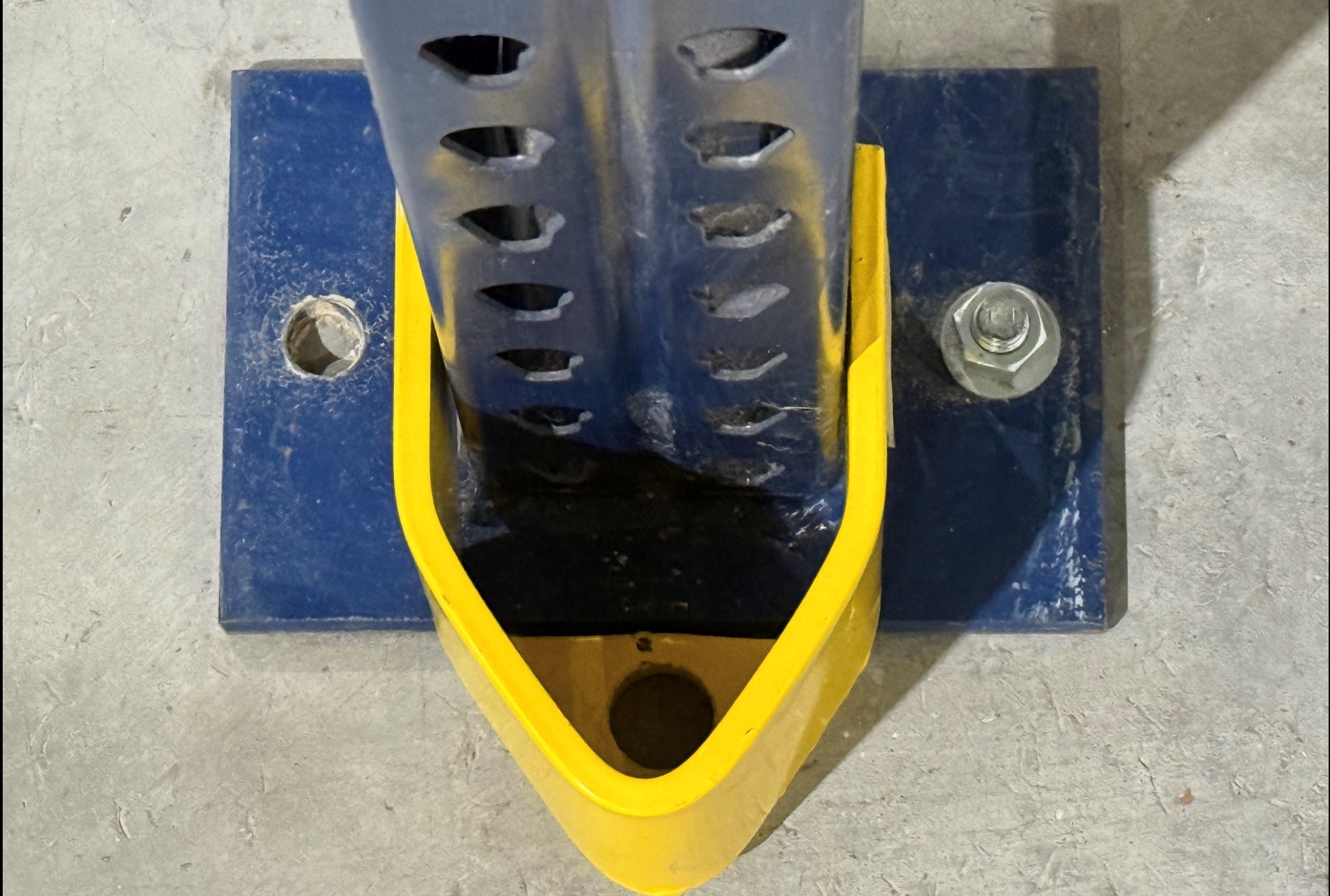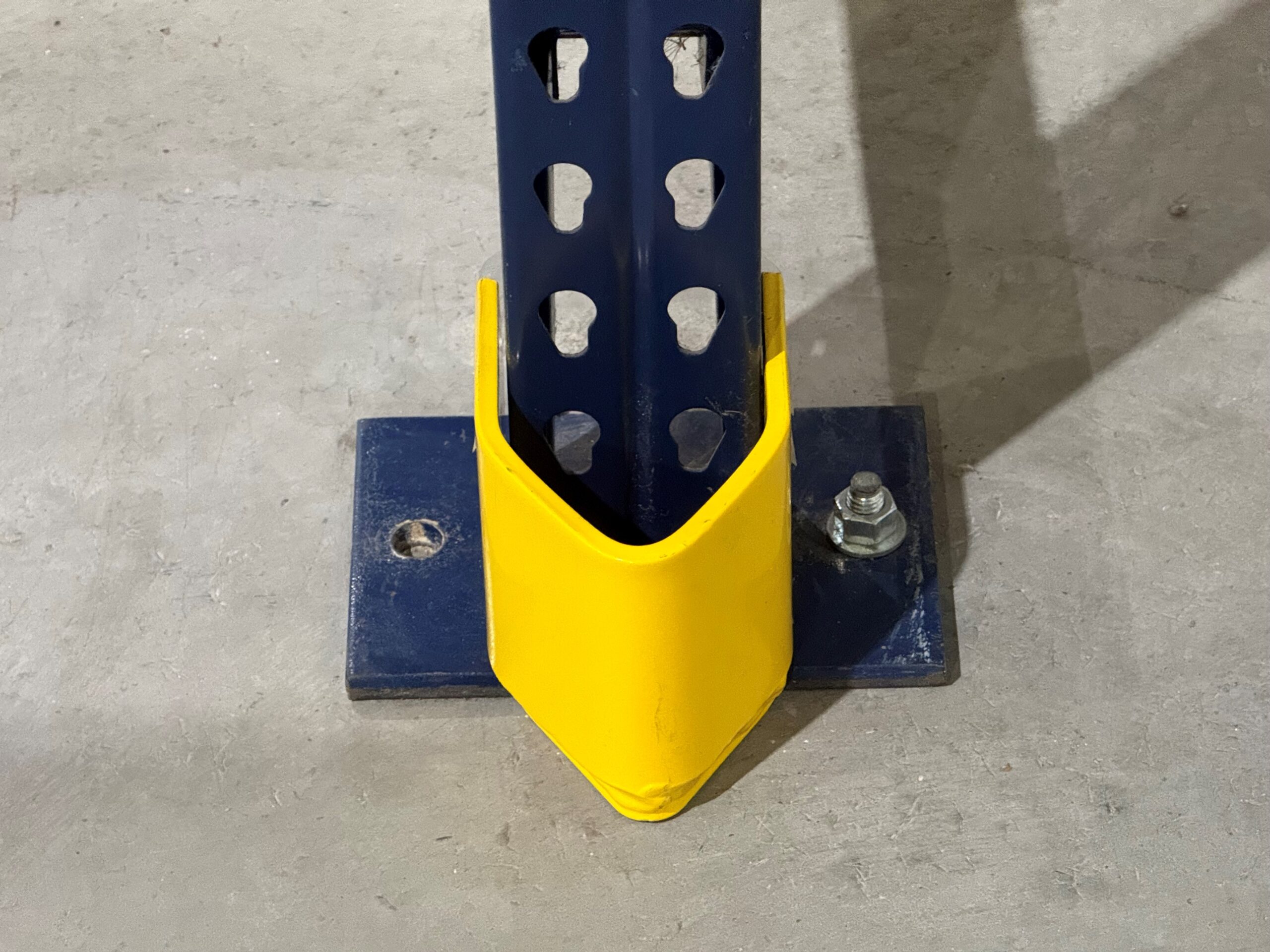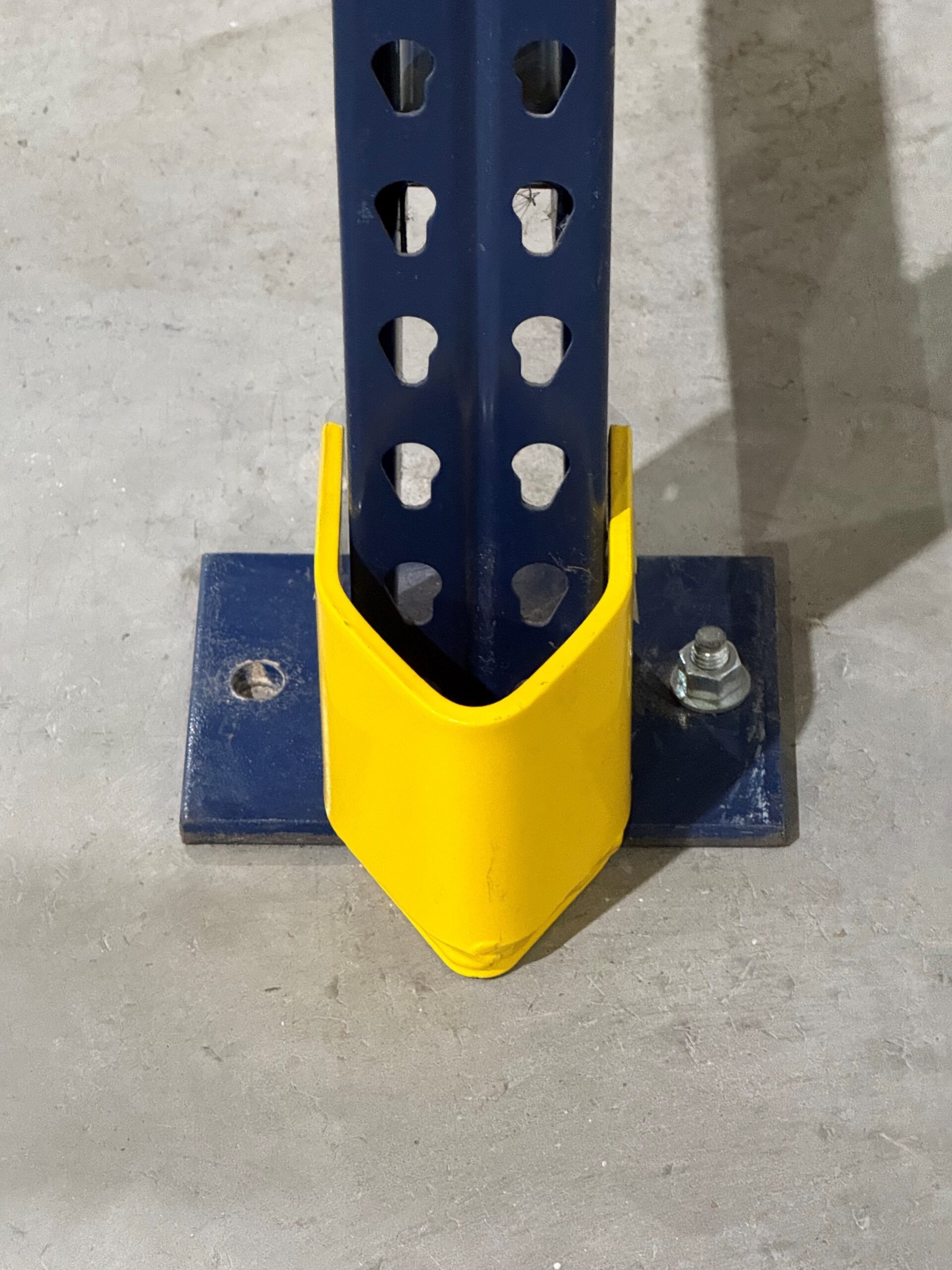 Installation is straightforward. Each V-nose protector bolts directly to the warehouse floor and requires a single anchor (anchor not included). The compact height keeps forklift outriggers from catching the upright while maintaining clearance for pallets and order pickers. The design makes it suitable for any warehouse, distribution center, or manufacturing facility operating reach trucks, narrow-aisle equipment, or high-traffic pick lanes.
