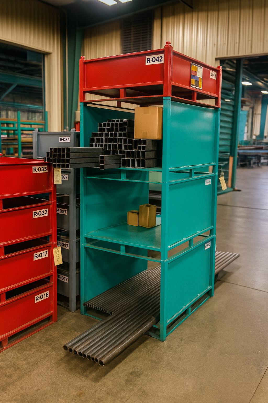Store long materials such as steel pipe, tubing, conduit, and bar stock safely and efficiently with our 2-wall cradle bins. Designed with two solid steel side walls and open front and back access, these bins make loading and unloading straightforward with a forklift or overhead crane. The cradled interior keeps heavy, cylindrical materials from rolling … Continue reading 2-Wall Cradle Bins For Steel Pipe & Tubing Stack on Smooth Sided Parts Bins