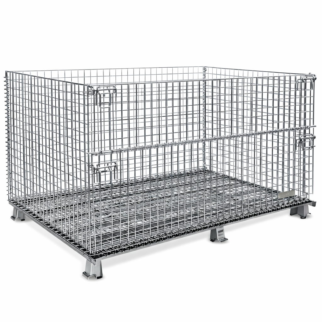 These containers are collapsible (knock-down design), reducing return freight costs and saving floor space when not in use. Finished in an electro-galvanized after-weld coating, they provide corrosion resistance and a clean appearance suitable for both indoor storage and supply chain movement. Each unit weighs 381 lbs. and is identified under Part Number: NDW548964864SS000G (CUSTOM), reflecting its purpose-built configuration for oversized storage needs.