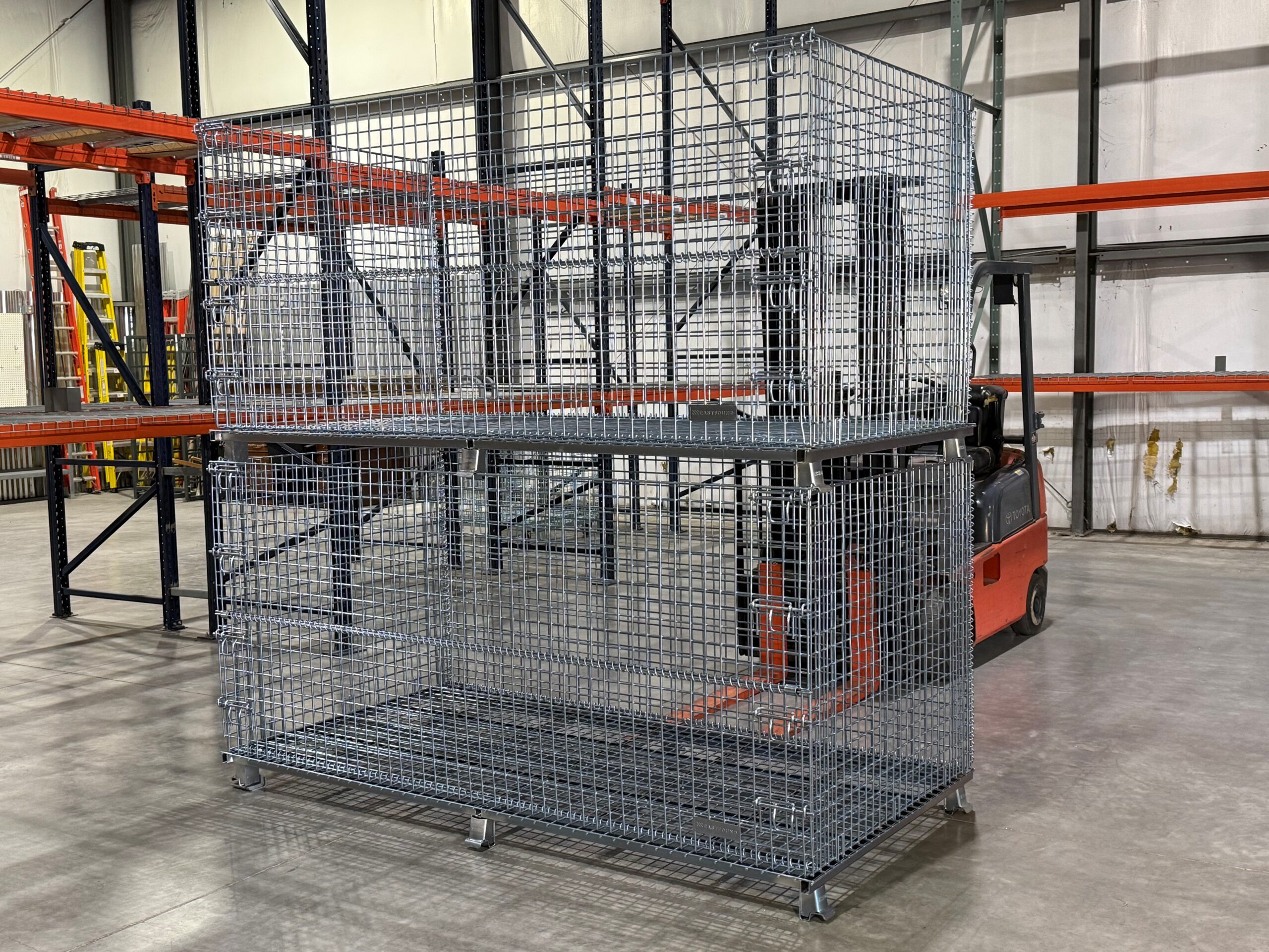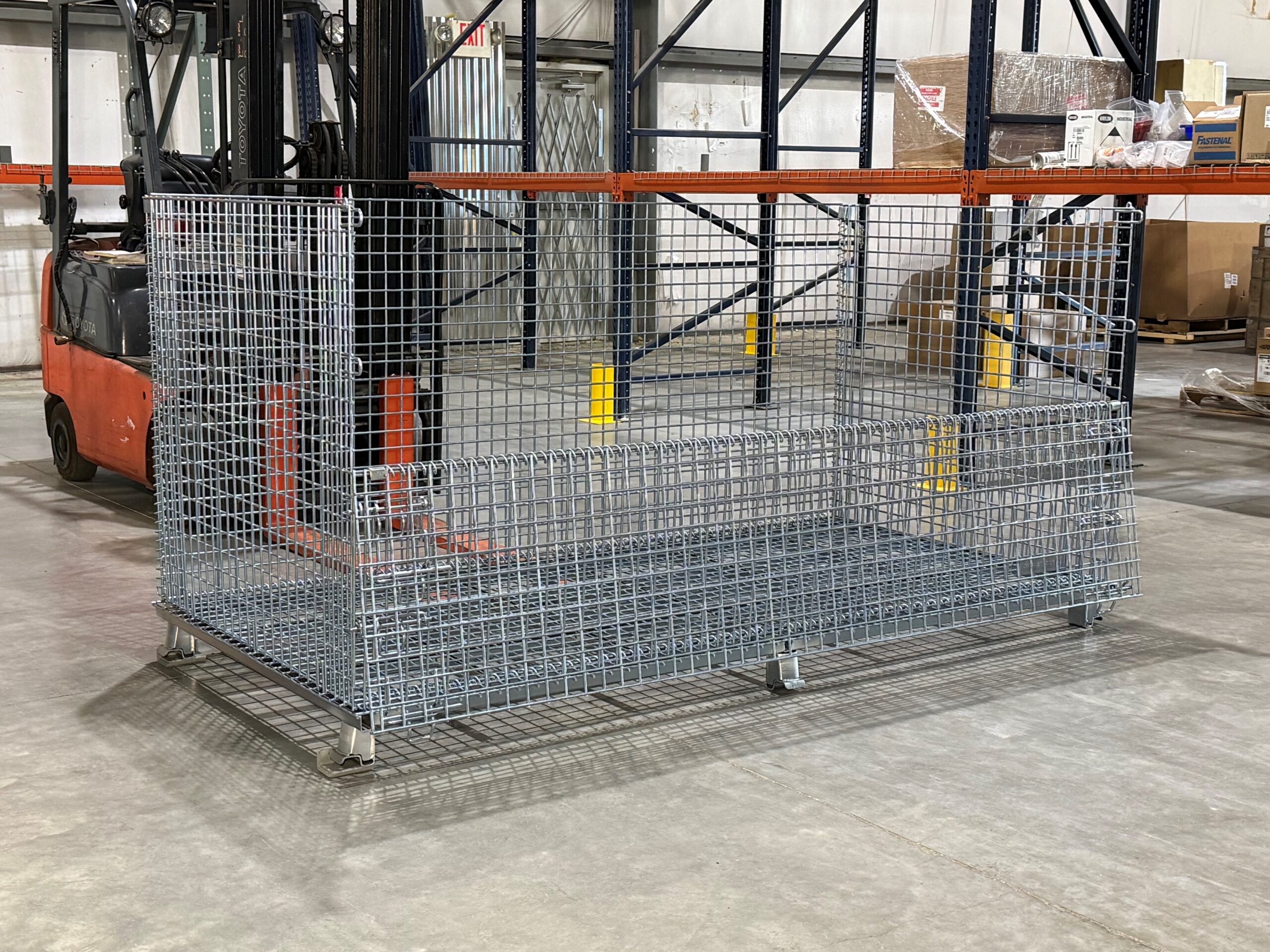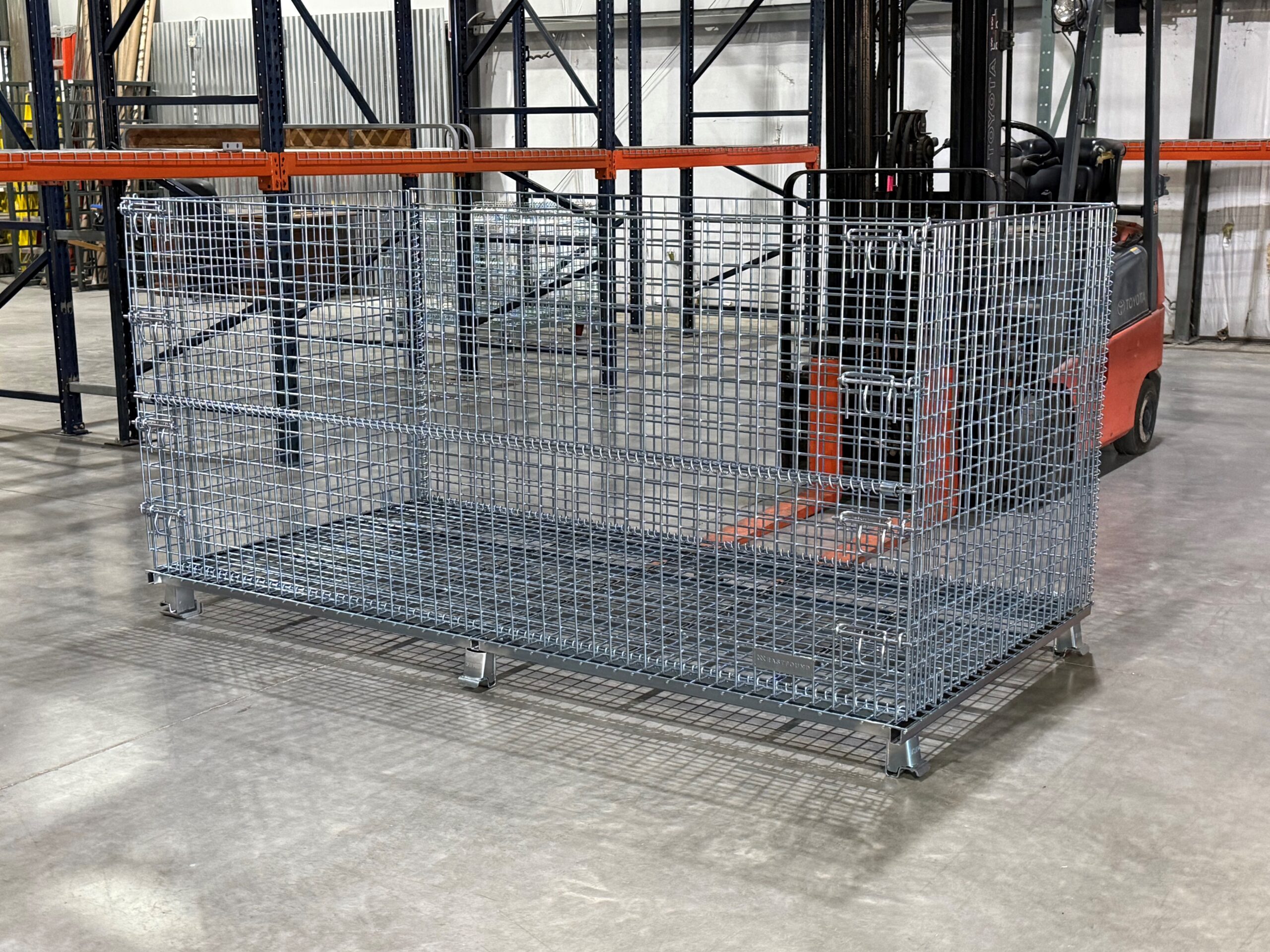 Each container is built for durability and features a 2,000 lb. load capacity (based on evenly distributed load) and is constructed with 2″ x 2″ x 2 gauge mesh on both the base and sides. An understructure and (6) robotically welded feet ensure consistent stacking performance and reliability in demanding warehouse and manufacturing environments. The unit is stackable two high when loaded, helping operations utilize vertical cube space. For access to long parts, a half-drop gate is positioned on the 96″ side, allowing ergonomic loading and unloading while minimizing product damage.