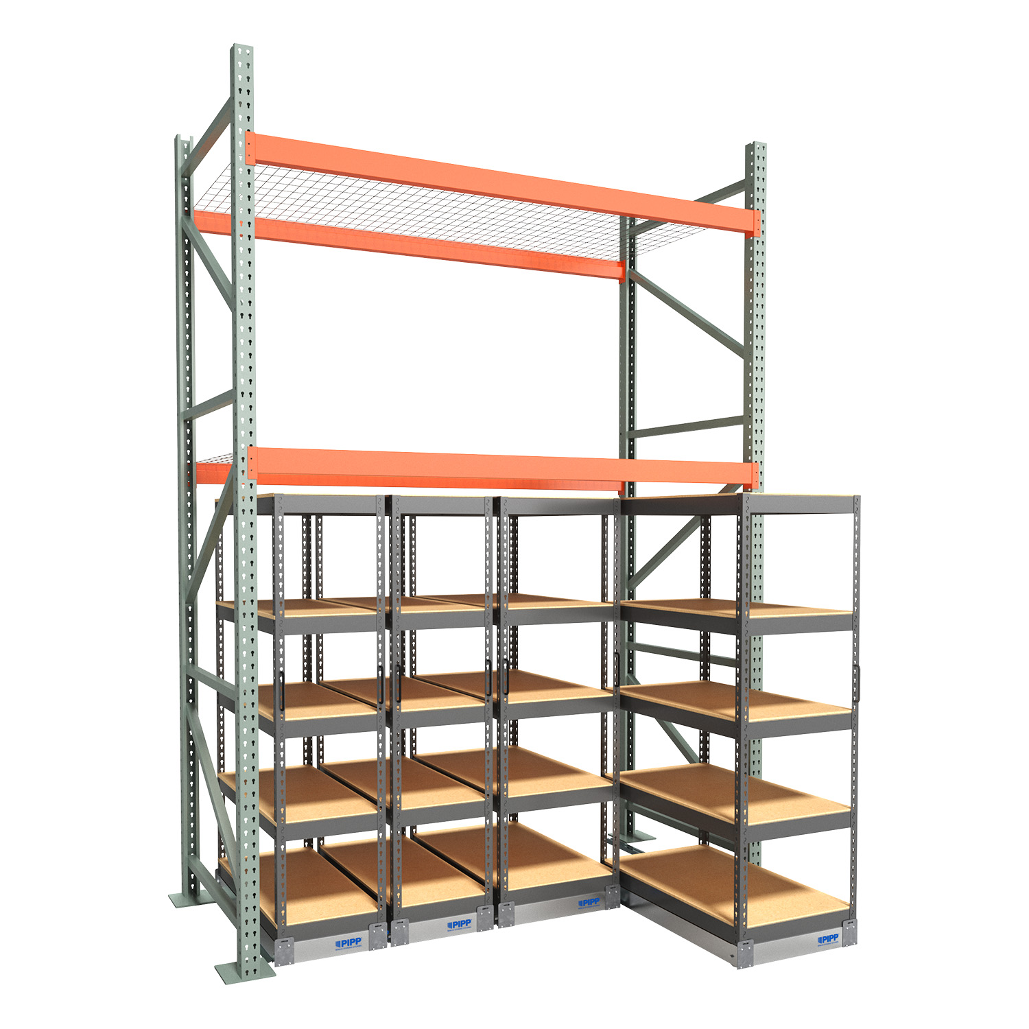 FOR 96″ WIDE x 48″ DEEP UNDER-RACK PLACEMENT: Consists of (2) 42″ w. x 24″ d. and (2) 48″ w. x 18″ d. Boltless Shelving Units on Mobile Base with (5) Shelf Levels. Includes Particle Board Decking. Weight: 881 LBS. Part Number: AIF0848-224-218-P